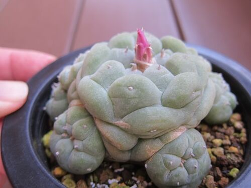 今から4年ほど前に 「疣翠冠玉 カキコ」の名で 購入した 苗です。 これまで 花が 咲くことは ありませんでしたが きのう 花が 上がっているのを発見!! 『こ! このツボミの色は! 翠冠じゃなく 銀冠じゃないのか!?』 昨年の秋ごろから イボイボ感が 増…