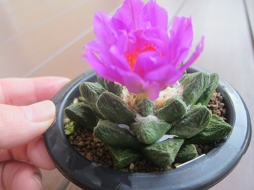 朝の気温が 10℃前後に なってきました。 太陽が 当たる前に サボテン フレームを 開けて サボテンの ようすを 確認しています。 とくに ちいさな 実生苗は 水が 切れて 土が乾燥していないか チェックしています。 写真は ひときわ 濃い赤色の花を 咲かせ…