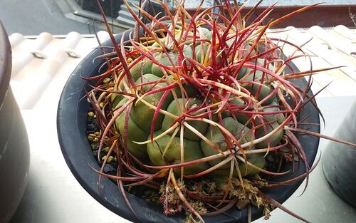 『緋冠竜』と 呼ぶに ふさわしく 『緋』色が キレイです。 下の株も 緋冠竜 実生株 クネクネと うねるトゲ にぎやかに なってきました。 株もとの 雑草は コニシキソウです。 1年生雑草なので 今の時期 枯れています。 たぶん・・・ たくさんのタネが ばら…