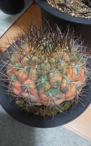 朝は 氷点下 あらかじめ ベランダに ならべていたサボテンを 室内に とりこみました。 写真は 尾形丸錦 実生株 ハデな錦と チョイ錦です。